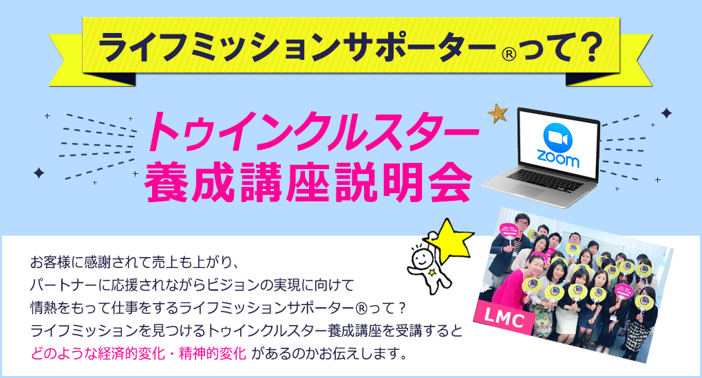 お客様に感謝されて売上も上がり、パートナーに応援されながらビジョンの実現に向けて情熱をもって仕事をしているライフミッションサポーター® になりたい方への【トゥインクルスター養成講座説明会】を実施します。
