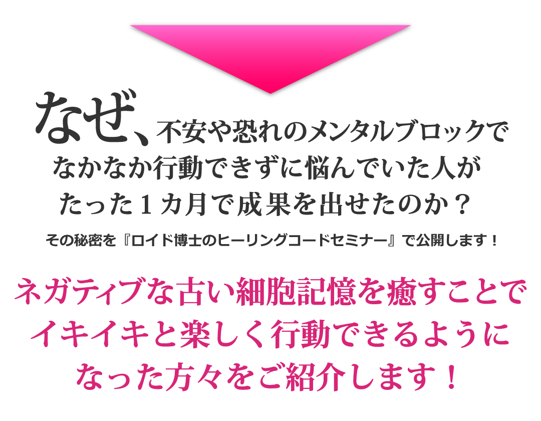 ヒーリングコードの講義は、実践的なワークと理論でしっかり構成されていました。ロイド博士の説明は量子力学などの最新科学に裏打ちされ、理論的でわかりやすく、なぜヒーリングコードが過去のネガティブな記憶から来るマイナスの周波数を打ち消すことができるかを理解することができました。実際にロイド博士によるヒーリングコードを実践したところ、「親との関係からきている、褒められても素直に受け取れない」パターンや、「起業後になかなか行動を起こせない」パターンを解消することができ、その結果、一か月で50人の体験モニターを集めることができました。