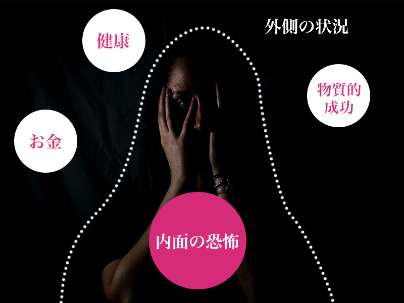 ほとんどの人は、内面に恐怖を抱えているにもかかわらず、お金・健康・物質的な成功等、外側の状況が変われば、心(内面)も満たされると勘違いしてがんばり続け、逆に上手くいかないスパイラルにはまっています。